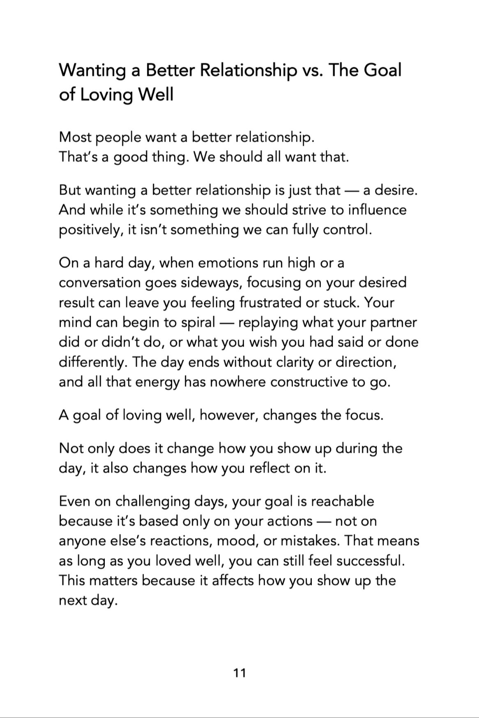 We came to Trent for coaching when we were separated. This daily practice of setting a one-day goal to love well, even when itâs not easy, helped give us a clear process to follow and ultimately saved our marriage. Weâre closer than weâve ever been, and weâre committed to this practice for life.